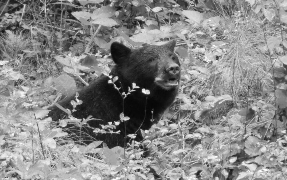 I remember one time when we were hiking in to do some fishing, I was running ahead and had reached the lake before my dad and brother. I took off along the trail that followed the shore. This path led to our favourite fishing hole. It was right at the narrows. Fish travelling from one part of the lake to another had to pass through these narrows. Partway down this trail, there was a small hill, not much higher than 3 or 4 meters. The brush at the top of the hill was pretty thick, with the trail cutting through it. I was running up the one side, going full tilt. I was unaware that there was a young black bear, which was also running up the other side, full tilt. The black bear must have heard our sounds echoing on the bluffs on the other side of the lake and was running away from it. We met at the top of this little hill, and as we slid to a stop, we were nose to nose with just our heads sticking out of the brush. We both took one long look at each other for a moment and then turned and ran in the opposite direction.