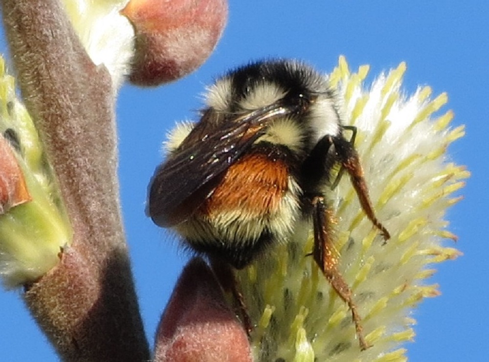 Red Tailed Bumblebee, Vancouver Island, BCThe female Red-Tailed Bumblebee is a large, black bumblebee with a red butt patch. Males are smaller than females and, along with the red tail, have two yellow bands on the thorax and one at the base of the abdomen. Read More….