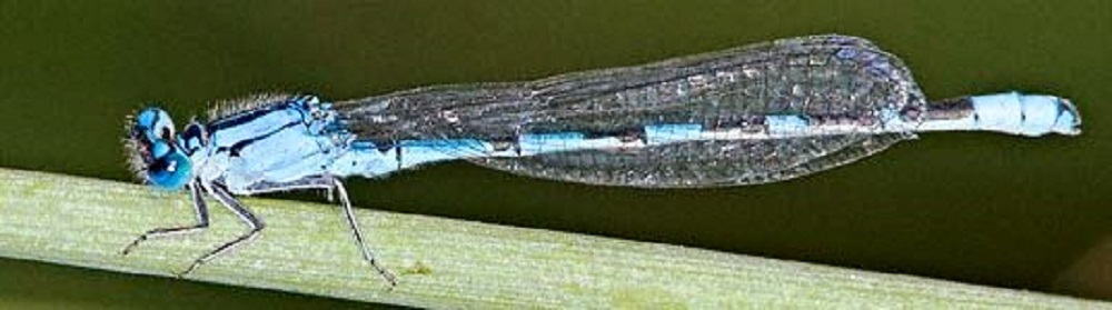 The Alkali Bluet Damselfly is a small damselfly, only up to 3.5 cm long. The males are blue on the sides of the thorax and the upper side of the abdomen. Females are light blue on the thorax to greenish-yellow on the tail. The upper side of the abdomen is mostly black, except for segment eight, which is blue.
