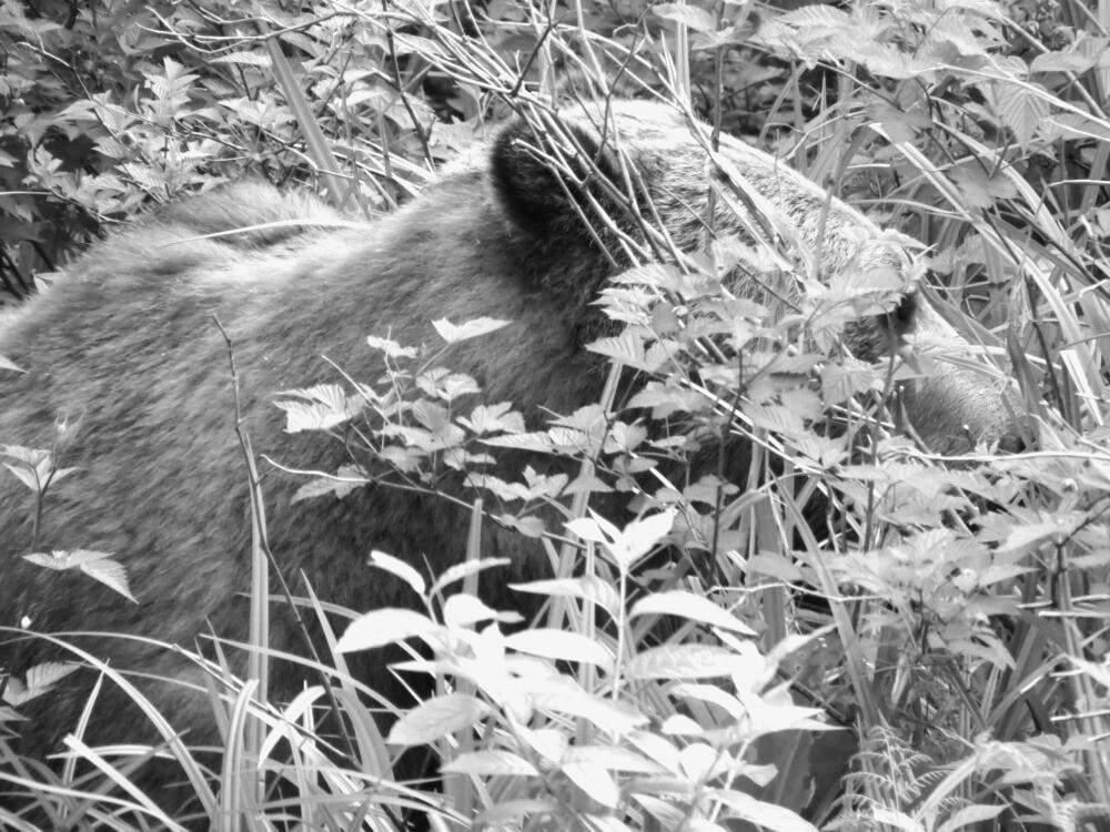 One sunny day after work, one of the boys and I were walking up the road toward a pool on the Noosgulch River that was great for fishing. The river has big old-growth timber that you hike through to get to a slow-moving deep pool. This was not far from camp, and it was good fishing. We were looking to get enough for a good feed for camp. The road was a temporary skid road cut into a steep hillside; there were sparse but big trees growing, and plenty of sand and scrub grass in between. It was steep. As we were walking along this road, smoking a joint, and just enjoying the day, we heard a sudden noise up the bank. It was a big grizzly bear. He saw us, and as he turned to head up the hill, he slipped and started to tumble down the bank. He rolled down until he fell off the steep upper edge and landed on the road with a very loud grunt from the bear. He stopped rolling right at the edge of the road and was having trouble retaining his balance. He looked just like a man, arms flailing around, trying to catch his balance, and then he slipped over the bank and continued to roll down the hill toward the river in a noisy and undignified fashion; he just rolled right out of sight. I looked at my companion and asked him if he had just seen what I saw. With the joint still in his hand, he said he had. I felt sorry for the bear.