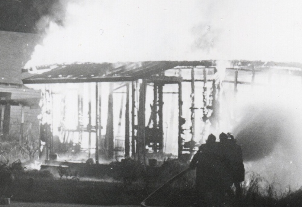 I landed on the floor by the front door, and I saw the flames go back down the hallway, and then they came back with a roar just as I was diving out the door. I had just lost everything I had. The flames were kissing my butt as I landed on the grass. As I lay there in bewilderment, I noticed my car was on fire where I had parked it by the house. Everything was gone, even my car. I had to run across the road and down to the public phone at the Duncan Bay store, shirtless and with no shoes.