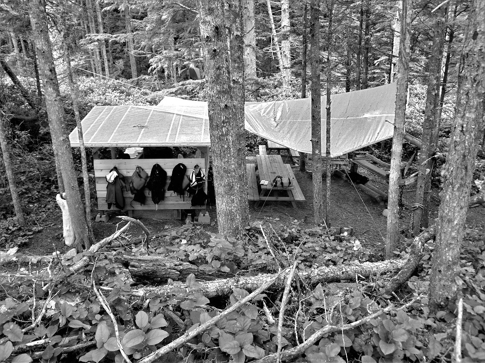 The rest of the day, we travelled down Blackfish Sound along the north shore of Hanson Island. We saw several whales off in the distance, but they were too far away from us. We did get to see deer, mink, seals, sea lions, and a few more porpoises as we headed to the east end of the island. We went between Hanson and Little Hanson Islands on the eastern end and arrived at our first camp, where we would spend the night. The company has 6 of these camps located in various places in the area, and they are incredible. There are 6 or more tents set up on platforms, covered cooking and eating areas, compost toilets and vistas that will take your breath away.