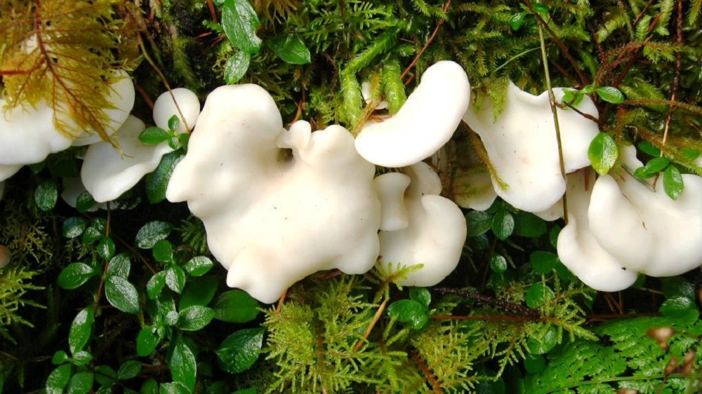 The Angel Wing Mushroom is a white, fan-shaped mushroom that grows shelf-like. It is a very thin-fleshed mushroom that feels dry and smooth to the touch, they could be hairy to the touch on top. The gills are quite crowded and have a narrow range in colour from white to cream; the spore print is white.