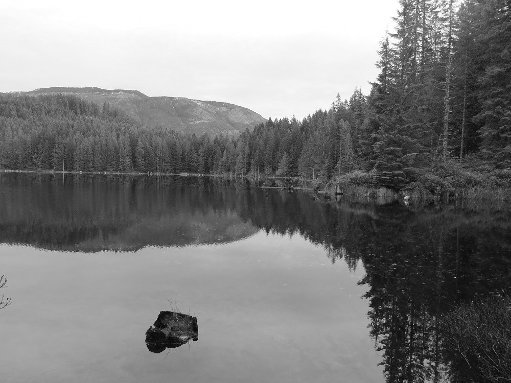 The lake is a very pretty lake surrounded by forests with some mighty big trees along the west side, some where the highway runs. This was not always so. When Elk River Timber’s camp 8 was going full steam, the west side of the lake was logged right to the lake. Rail trestles crossed the east side of the lake, and the camp was on the north-eastern shore.